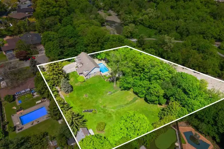 Imagine … waking up every morning in your beautiful home and looking out over an expanse of land, trees and the sounds of nature including the water sounds of a creek. Now imagine this in Mississauga. There aren’t many properties like this one! Perfect for Builders and End Users alike! Charming 4-bedroom home on expansive lot backing onto Etobicoke Creek. Move in and enjoy, or add on and expand, or build your dream home, or sever the property into lots. The possibilities are endless on this one-of-a-kind property, a lovely home on a massive, very private lot at the foot of Sherway Drive, backing onto Etobicoke Creek. The lot covers nearly two acres in total with approx. .74 acres of buildable land (the rest is protected greenspace). With peaceful surroundings and mature trees and the sounds of Etobicoke Creek, this warm and inviting 2855 square foot, 4 bedroom, 4 bathroom home (offering a total of 3659 sqft of total living space) is perfect for the family and entertaining. The spacious living and dining area is filled with natural light while the oversized family room features a vaulted, beamed ceiling, rich wood accents and a cozy wood burning fireplace. The recently refreshed white eat-in kitchen offers ample cupboard space, a large centre island and picturesque views of the backyard with its inground pool and trees, facing the creek. The upper level includes four generously sized bedrooms, including a primary suite with two walk-in closets and ensuite. The finished basement offers additional living space with a rec room, office, powder room and loads of storage. Need more space? Check out the outbuilding/cottage, perfect as a home office, guesthouse, studio, or retreat. Whether you choose to enjoy the home as it is, expand, build your new dream home or sever the lot, the possibilities are endless! Conveniently located just minutes from the QEW, 17km to downtown Toronto, and 17km to Pearson Airport. A rare opportunity to own a remarkable piece of land.