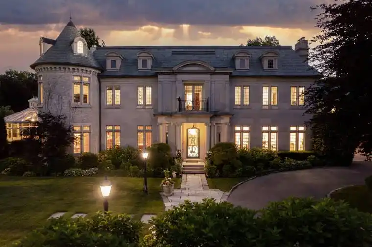 Arguably one of Torontos most iconic estates, this French-style château is an extraordinary expression of European grandeur on a 3.12-acre double lot in the prestigious enclave of Bayview Ridge. Designed by renowned architect Gordon Ridgely, the residence commands unobstructed western views over the Rosedale Golf Club. Beyond the stately stone gates and circular drive, manicured gardens by Ron Holbrook frame a breathtaking setting featuring a negative-edge infinity pool, a reflecting pond with a stepped waterfall, tennis court, kitchen gardens, flagstone terraces, and a stone cabana. The striking façade spans nearly 150 feet, clad in Indiana buff limestone and rubble stone with Vermont unfaded green slate shingles and lead-coated copper details. An ivy-clad turret anchors the asymmetrical design, lending the home its signature silhouette. Inside, over 15,000 square feet of living space showcases Brazilian cherry wood floors with African wenge inlay, acid-etched antique Crema Marfil marble, coffered ceilings, Indiana limestone fireplaces, and solid North American cherry doors. Six principal bedrooms and two additional suites are complemented by ten baths and warm, richly detailed interiors. The main floor features an impressive library and office with wood-burning fireplace, a grand dining room with artisan-painted walls and ceilings, a conservatory beside the spacious family room, and a sunlit morning room perfect for coffee. Three staircases, including a hidden passage, lead to the lower level with a Bordeaux-inspired wine cellar, cigar room, gym, nanny suite with two bedrooms, a full kitchen, and a large recreation space. Upstairs, the primary suite offers a six-piece spa bathroom, dual dressing rooms, gas fireplace, and sweeping views. Each bedroom enjoys an ensuite bath and sitting area, blending luxury with practicality. This remarkable estate is a once-in-a-generation offering at once grand, intimate, and built to endure.