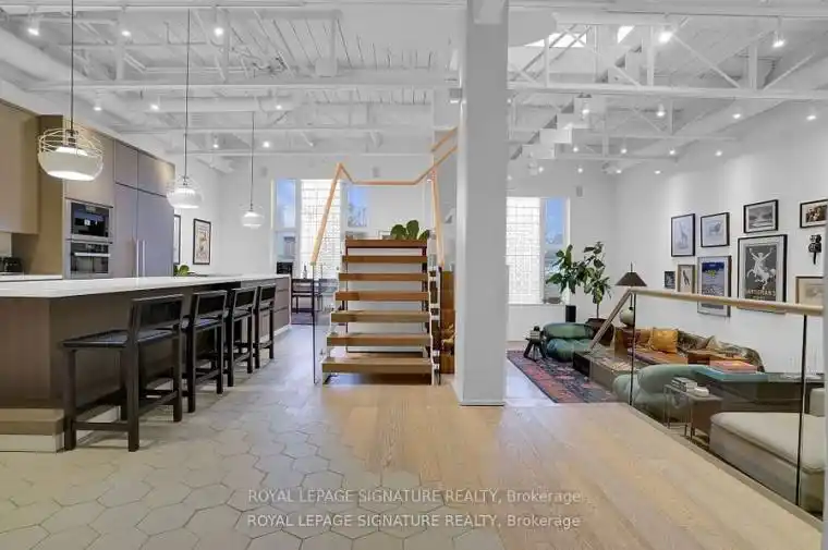 Experience authentic loft living with all the modern comforts you desire. This luminous two-story haven features soaring 20-foot ceilings, exposed ductwork, striking skylights, and a bespoke staircase that makes a bold architectural statement. Originally converted into just 19 unique lofts in 1996 by acclaimed architect Bob Mitchell, the building has been thoughtfully renovated with custom finishes throughout. Step into a sunken living room accompanied by a cozy fireplace perfect for relaxing. Just off the living area, a stunning open-concept den perfect for an office with amazing built-ins. The home boasts a massive primary bedroom with a spa-like ensuite that opens directly onto a private balcony, your own serene escape in the city. With three spa like bathrooms included in the unit, comfort and convenience are never compromised. An expansive eat-in kitchen and generous size dining area make hosting effortless, while the included parking spot and furnished interiors add ultimate ease to everyday living. Tucked between King West and Queen West, this rare gem captures the essence of New York loft living right in the heart of Toronto.