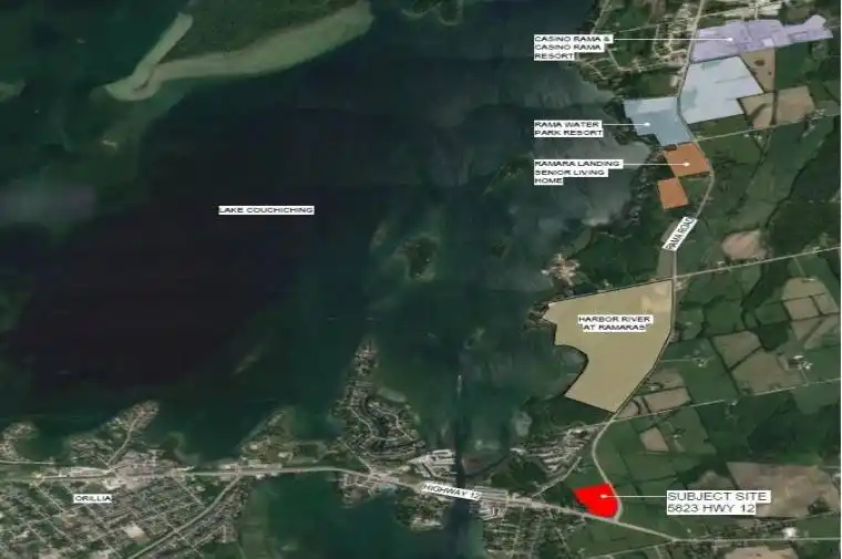 A future commercial development site as a sleek, modern hub with dynamic architecture and thoughtful landscaping. Presenting a rare and high-potential mixed-use development opportunity at 5823 Highway 12 in Ramara, Ontarioan expansive 13.156-acre parcel strategically located at the intersection of Highway 12 and Rama Road, minutes from Lake Simcoe, Casino Rama, and Orillia. The site benefits from excellent visibility and access, with future road upgrades anticipated and proximity to major regional corridors. Environmental studies indicate minimal constraints, with a small wetland buffer in the northwest corner and inclusion in the Lake Simcoe Protection Plan area. Planning work is underway, including traffic impact, stormwater management, and market analysis. With pre-consultation completed and municipal support for intensification, the site is primed for a transformative project featuring approximately 469,366 sq ft of gross floor area. One of the proposed concepts includes 58 townhome units across nine blocks, a 105-unit, seven-storey seniors residence, two single-storey commercial buildings with 10 retail units and a drive-through, and a six-storey hotel with 126 rooms. Zoned Village Residential (VR), the property permits multi-unit dwellings, care facilities, and accessory commercial uses, with septic and well systems currently allowed and municipal servicing under review. .