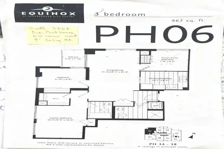 SUB-PENTHOUSE immaculate, bright with lots of natural sunlight. NW Corner unit with 9 foot ceilings, OPEN CONCEPT, LARGE PRINCIPAL rooms, FLOOR EFFICIENT AREA of 967 SQ. FT. able to FIT FULL SIZED FURNITURE! Fabulous UNOBSTRUCTED VIEWS. GREAT FENG SHUI !!! Wallkout to Balcony from Living Room. Easy to convert Dining room back to OG 3 Bedroom Builder’s Floor Plan. The Maintenance fee breakdown to $931.27 unit fee, $29.35 Locker fee, and $74.07 parking fee. Extra building amenities incl. 2 guest rooms, & ample FREE Visitor’s P1 parking. CONVENIENT LOCATION to Scarborough Town Center, Scarborough Civic Center, Scarborough U of T bus stop, Park, Subway, Megabus, GO Bus & minutes to Hwy#401. *** A RARE FIND!***