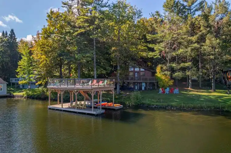 Welcome to this beautiful & unique A-frame cottage on Lake Muskoka in Port Carling, the heart of Muskoka. This 4-season cottage is fully renovated and ideally located across from Hanna Park and beach. Boat to downtown Port Carling in 2 mins and enjoy shopping, dining and watch the Segwun steamship travel through the locks over to Lake Rosseau. This rare property offers expansive waterfront living with 211 ft of waterfront, a recently improved dock, complete with a 700 sq. ft. sun deck and a covered single boat slip. The sleek glass railing on the deck makes it perfect for entertaining or simply relaxing while soaking in the views. This property offers easy access to Lake Rosseau and, from there, Lake Joseph, giving you seamless boating between all three of Muskoka’s most sought-after lakes. The dramatic A shape floods the interior space with natural sunlight through its soaring windows. The recently renovated kitchen provides ample room for cooking and entertaining. Flowing from the kitchen is an open concept dining and living room, complete with a floor-to-ceiling stone fireplace, inviting family and friends to make lasting memories. Enjoy your meals or morning coffee on the wrap-around deck accessible from the dining room and kitchen. On the main floor, there are two spacious bedrooms and a full bathroom. The second-floor loft, with its own bathroom, offers scenic views of the waterfront through the large windows, a truly breathtaking spot to unwind. The lower level continues the open concept living with a large family room, two bedrooms and a full bathroom. Walk out from the lower level to a stone patio, which includes an expansive fire pit at the water’s edge and a 6-person hot tub overlooking the lake and boathouse. Significant upgrades bring peace of mind, including a new septic system, improved crib/dock and boathouse (2023), 24 kW Generator, and electric car charger. This property has a successful track record of rental income.
