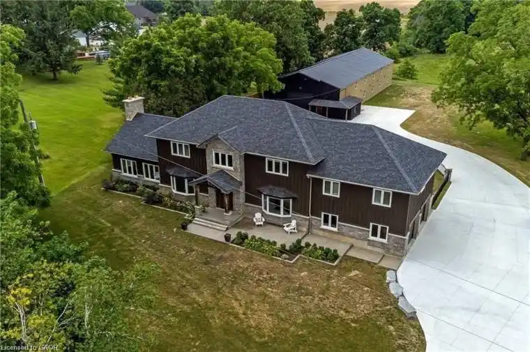 This stunning 5-bedroom, 2.5-bathroom home spans over an energy efficient 3,800+sq/ft and is perfectly positioned to overlook the breathtaking Grand River. Nestled on a generous lot overlooking rolling fields at the back and river access just across the street, its an ideal setting for those who love the outdoors. Adding to its appeal, a massive 100 x 40 detached shop provides endless possibilities for hobbies, storage, or business use (w/ high speed fibre internet). The main floor boasts a spacious and inviting layout with 9ft ceilings, featuring a custom kitchen with a wood-paneled ceiling, stone countertops, a stylish herringbone backsplash, and a large islandperfect for gathering with family and friends. The adjacent dining room, with its tray ceiling and wood accent wall, offers picturesque views of the Grand River. The oversized great room is a true showstopper, complete with a floor-to-ceiling stone fireplace, vaulted ceiling, and expansive windows that frame stunning views in every direction. Step through one of two patio doors to your private outdoor oasis, featuring a large covered patio and built-in outdoor kitchen, ideal for entertaining. On one elevated side of the home, the primary suite offers a peaceful escape with a walk-in closet and a luxurious ensuite, complete with a custom tile shower. The second level hosts four additional bedrooms and a full 4-piece bathroom. The versatile basement offers even more potential, with its own private entrance from the attached double garage, making it an excellent option for an in-law suite or additional living space. For those needing extra room for vehicles, equipment, or recreational toys, this property delivers! The huge concrete parking area and driveway ensure ample outdoor storage/parking for vehicles/trailers. Dont miss this rare opportunity to own a spectacular home in a prime location with endless possibilities! Luxury Certified.