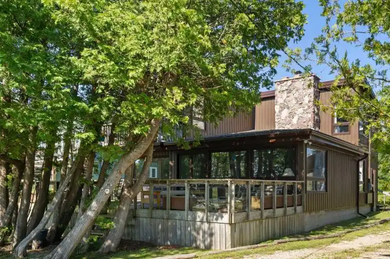 Lakefront Living with a great beach and unforgettable sunsets. Welcome to your dream retreat on the shores of Lake Huron! This 3 bedroom, 2 bathroom Viceroy home boasts stunning cathedral ceilings and a stone fireplace that anchors the spacious living room. Beautiful water and beach views through the large windows and two patio doors; one leading to a water view 17 foot x 30 foot deck, the other to a private balcony with sweeping views of the sandy beach below. The oversized 30′ x 30′ heated four season garage is a great workshop, for all your tools and all your toys. Even better, the garage features a 2 bedroom, 1 bathroom loft with a full kitchen, ideal for guests and extended family. Whether you are looking for a year round home or a lakeside escape, this property has it all, comfort, space, and unbeatable waterfront views. All windows replaced in 2021 (Northstar, most triple pane), Siding 2021, Garage built 2003 with radiant in floor heat with separate zones upper and lower. New raised septic system in 2003, drilled well. Easy access to the fine sand beach directly across the road or walk north on Bay Street past 3 cottages to the sign “Hannigan Cottage”, access the beach through the boardwalk. The beach and waterfront are great for kids and puppies as well as kayaking, fishing, paddle boarding, sailing power boating and all other watersports. Or just relaxing by the water. A rare find on this bay, this property has been owned by the same family for over 25 years. Properties like this don’t come upon ofter… close to Sauble Beach, Southampton, Tobermory and Owen Sound