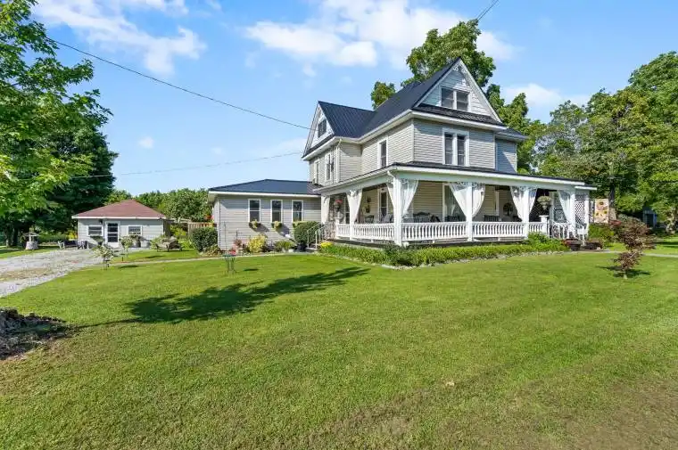 This is the country property of your dreams! From the idyllic front porch where you’ll want to spend mornings & evenings relaxing to the quiet hum of rural life. This century farm house is oozing with charm & character with over 3000sqft of living space. Spacious rooms with oversized bright windows with original woodwork & doors throughout. Recently renovated kitchen complete with modern farmhouse feel. Ample cabinetry with high end finishes & natural gas stove. Two staircases that lead to 2nd level where you’ll find 3 generous bedrooms, 4 pc bath & laundry room. After a long day you’ll enjoy retreating to the 3rd level where you’ll find an incredible primary bedroom with sitting area & dressing nook. From the cozy family room with gas fireplace take french doors to private back deck with refreshing pool overlooking your private backyard. With an oasis like this you may be hosting every family and friends get together. The best part – they can stay in the bachelor style bunkhouse! Set it up as a cozy guesthouse with kitchenette or perfect home office. The huge accessory building (62×38) is the perfect place to store toys or have a workshop with a bonus 2nd storey loft and overhead hoist. All this country charm on 2+ acres with possibility of a severance. No rear neighbours, walking distance to a beautiful sand beach on the shores of Lake Erie, this country home has all you need or desire. Buyer to do their own due diligence regarding severance.