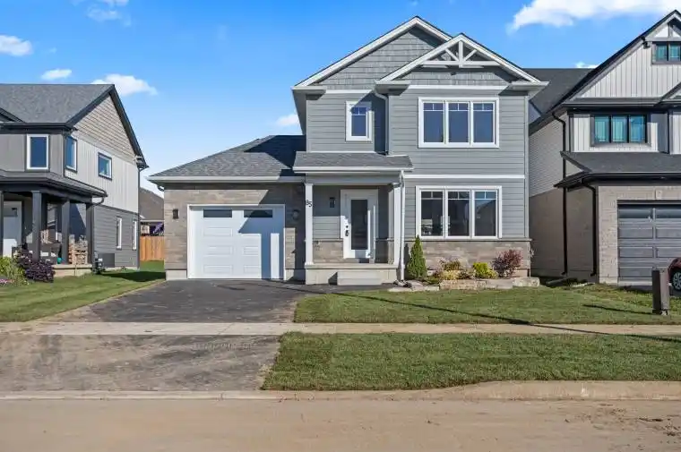 Welcome to “The Signal” by Karwood Homes – a beautifully designed two-story residence located in the highly sought-after Harvest Run community of St. Thomas. Only two years new, this 1,428 sq ft home blends modern style, functionality, and comfort to create the perfect space for today’s lifestyle. Step inside to an inviting open-concept main floor featuring a bright living area with large windows that fill the space with natural light. The contemporary kitchen offers generous counter space, a central island for casual dining, sleek cabinetry and a walk-in pantry for added storage. The adjoining dining area opens directly to the private concrete patio – an ideal setting for morning coffee or evening entertaining. Upstairs, you’ll find well-proportioned bedrooms including a spacious primary suite with a walk-in closet, complemented by a modern main bathroom. The unfinished lower level offers endless possibilities for customization, already equipped with a rough-in for a 3-piece bath – perfect for a future recreation room, gym or guest suite. Outside, the property has been beautifully enhanced with brand-new professional landscaping and a freshly installed driveway, adding to the homes curb appeal and providing a low-maintenance, polished exterior you’ll be proud to come home to. Located in a family-friendly neighbourhood close to schools, parks, shopping and easy access to London and Port Stanley, this home presents an incredible opportunity to own a nearly new property in one of St Thomas’s most desirable developments. Move-in ready, stylish and built for modern living – The Signal at Harvest Run is ready to welcome you home.