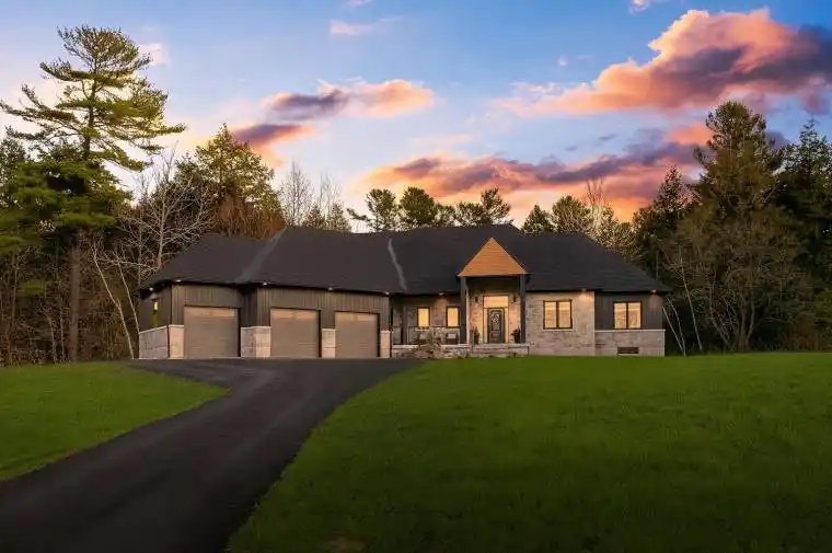Welcome to this stunning custom-built bungalow, perfectly situated on a sprawling lot just under 2 acres. The striking stonework of the exterior sets a refined tone for this elegant home, showcasing its timeless design and exceptional craftsmanship.Inside, the oversized 3-car garage offers ample space for vehicles and storage, seamlessly complementing the homes thoughtful layout. The main living area is a true showstopper, with soaring 13-foot ceilings, a built-in electric fireplace, and a walkout to the deck and spacious backyardperfect for both relaxing and entertaining.Throughout the rest of the home, 9-foot ceilings maintain a sense of openness and elegance. The chefs kitchen is designed for both beauty and functionality, featuring quartz countertops, premium built-in appliances, and a layout ideal for hosting or everyday living.The primary suite is a luxurious retreat, complete with its own walkout to the deck, offering serene views and a seamless connection to the outdoors. The spa-inspired ensuite features his-and-her sinks and exquisite finishes, adding a touch of indulgence to your daily routine.Enjoy your own privacy, land, and piece of paradise, all while staying just minutes away from major shopping areas and Highway 401. Set on a peaceful, expansive lot, this home offers a perfect blend of tranquility and convenience. Schedule your private tour today to experience this exceptional property for yourself!