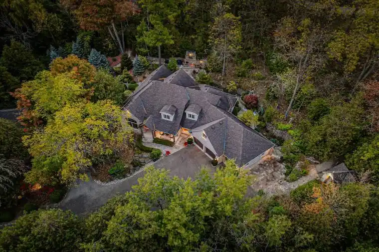 Set against the limestone escarpment on a private 1.1-acre lot at the end of a quiet road in Rockwood, this extraordinary retreat is surrounded by conservation land, offering complete privacy and a deep connection to nature. What began as untouched forest became an architectural masterpiece – the result of over three years of meticulous planning, permitting, and passion. Eighteen feet of rock were carved away to shape the foundation. A centuries-old log cabin from Ariss was carefully deconstructed and reassembled on-site, bridging history with modern innovation. Even the entrance was designed to impress – complete with its own handcrafted bridge leading to the home’s grand arrival. Inside, the craftsmanship speaks for itself. Soaring cathedral ceilings, oversized windows, and panoramic forest views create an atmosphere that’s both inspiring and serene. The main living area opens onto a European-style stone courtyard, while the primary suite feels like a private spa, complete with a luxurious ensuite and its own tranquil waterfall outlook. Upstairs, two additional bedrooms and a full bath offer comfort and flexibility for family or guests. The walk-out basement opens to a stunning flagstone patio complete with a hot tub – an ideal spot to unwind in total tranquility. Inside, enjoy the well-appointed entertainment level featuring a custom bar and private wine cellar, a pool table area perfect for friendly competition, a theatre room to catch the big game, a dedicated gym space for workouts, a full bathroom, and more. And then there’s the historic 550 sq. ft. log cabin – beautifully restored and ready to serve as a guest house, creative studio, or personal sanctuary. Outfitted with a wet bar, gas fireplace, full bathroom, and ample storage, it’s a destination all its own. A triple-car garage with lift provides ample room for vehicles, hobbies, and adventure gear, blending practicality with luxury. Schedule a private showing today to experience 198 Pasmore.