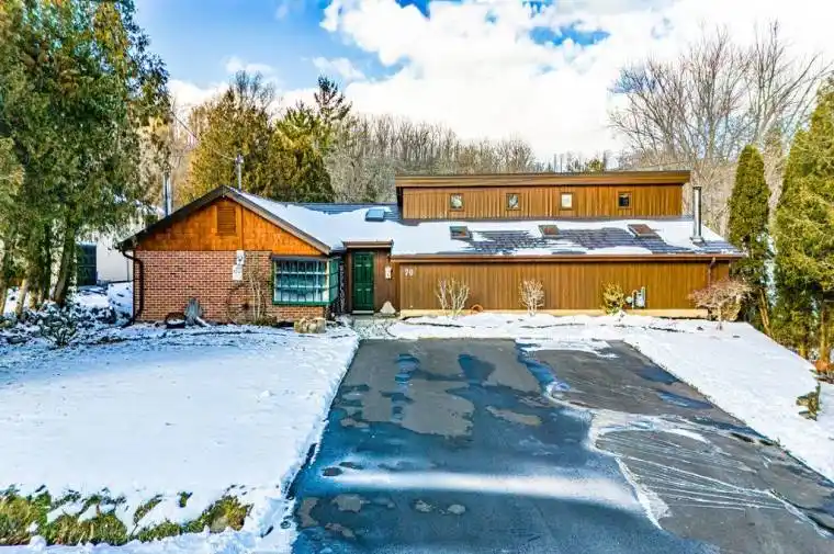 Tucked on a quiet cul-de-sac with Escarpment views and access to the Bruce Trail, this rare mid-century modern ranch features a loft and blends modern style with rustic, handcrafted character. Wrapped in natural textures – flagstone, reclaimed brick, and warm woods – and bathed in sunlight from 19-foot vaulted pine ceilings and multiple skylights, this 3 bed, 2 bath home (including 2 bedrooms and a full bath in the airy loft) delivers major one-of-a-kind energy. Set on a private 84 215 ft lot, it offers a true sense of retreat. The foyer introduces the home’s boutique atmosphere with natural timber, masonry accents, angled ceilings, and soft daylight. An indoor hot tub adds unexpected luxury, framed by picture windows overlooking the serene backyard. The main living areas flow easily from here: a warm living room with gas fireplace, crafted wood shelving, and a charming corner window, an open dining space connected to a stunning kitchen with exposed beam trusses, granite counters, built-in gas cooktop, floating shelves, and a modern chimney hood. A main-floor primary suite sits privately at the rear with a 3 piece ensuite and convenient laundry nearby. The lower level is a true entertainer’s playground, showcasing floor-to-ceiling brick, a spacious bar, tranquil indoor waterfall, and a natural wood-burning stove. This impressive space remains visually linked to the main floor with an open view to the loft above. Recent updates include 2019 furnace, AC, and owned water heater, and a 2017 metal roof with 8 skylights, and a 20 20 insulated garage with inside entry.
