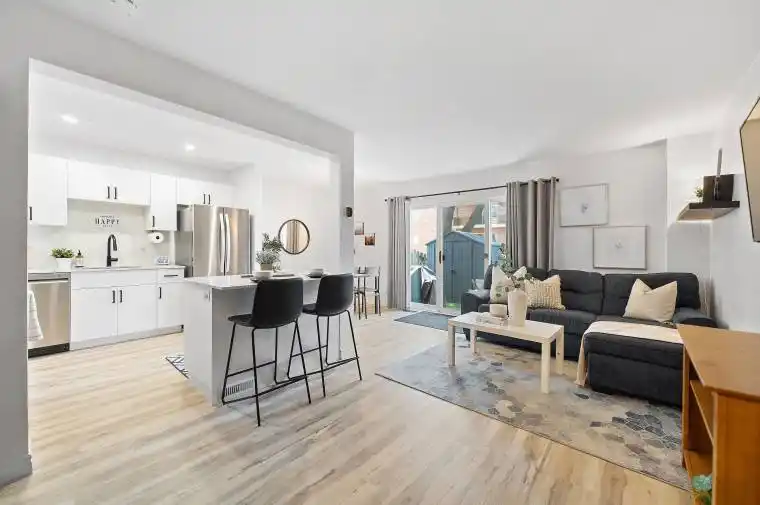 Stunningly renovated 3-bedroom, 1-bathroom two-storey condo townhome in St. Catharines desirable Carlton neighbourhood. Tucked away at the back of a quiet, family-friendly complex, this home offers added privacy, a fully fenced backyard, and a stylish, move-in ready interior. Features a bright, open-concept main floor with new vinyl plank flooring throughout, large principal rooms, and a custom kitchen with modern cabinetry, stainless steel appliances, quartz countertops, and a breakfast island. Sliding patio doors lead to a private yard with patio, green space, and a shedperfect for relaxing or entertaining. Upstairs includes 3 spacious bedrooms with contemporary finishes and a renovated 4-piece bathroom. The partially finished basement adds flexible space for a rec room, home office, playroom, additional bedroom or gym. Freshly painted throughout, move-in ready and located near parks, schools, shopping, and transitthis home offers the benefits of condo living without compromising on space or lifestyle.