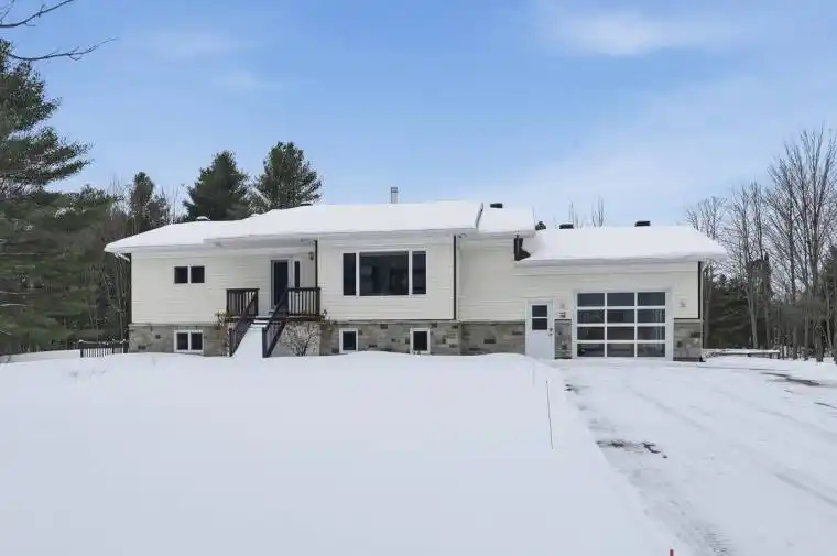 Nestled on (almost) 25 sprawling acres, this recently renovated raised-bungalow offers unparalleled privacy and tranquility. Escape the everyday in this idyllic setting, boasting a brand-new chef’s kitchen perfect for culinary enthusiasts and a luxurious, completely remodelled bathroom. Whole main floor renovated top to bottom including a large primary bedroom complete with a custom-built walk in closet. Car enthusiasts and hobbyists alike will appreciate the oversized garage and the expansive detached workshop, providing ample space for projects and storage. Enjoy the serene beauty of a large pond, complete with a private dock, ideal for fishing, relaxing, or simply soaking in the natural surroundings. Adding a touch of rustic charm, discover a finished outhouse on the property complete with a wood stove. Backs onto Forêt Larose. This show-stopping estate is ready for you to call it home!