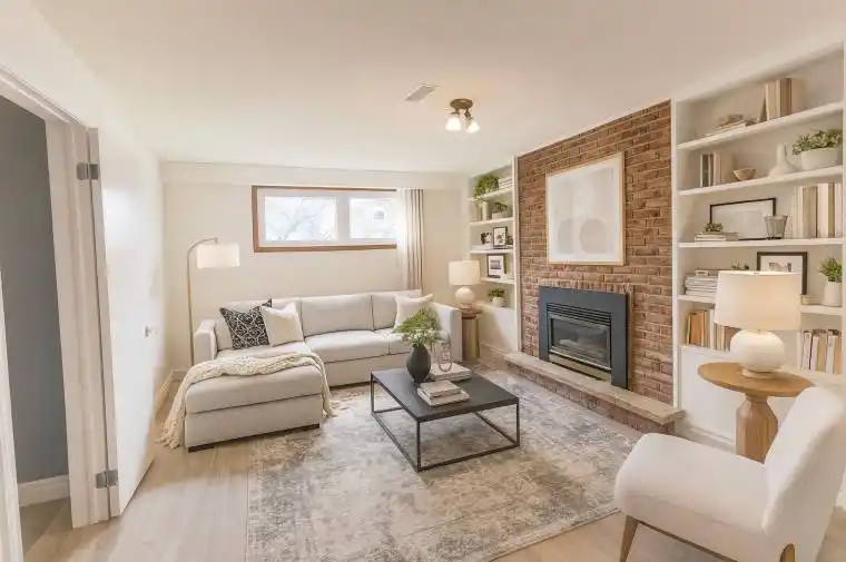 Conveniently located by Oakville Town Hall, Oakville Place Mall and Sheridan. This 2 Bedroom unit has over 860 SqFt and 8 Ft High Ceilings. The Renovated Kitchen features Quartz Counters and a new S/S Fridge, Stove, Fan. No extra cost with your very own side by side Washer/Dryer. A Renovated Bathroom with a Quartz Vanity and Tall Shower. The Huge Living Room has a Fireplace Feature Wall and a Window that expands the entire width of the room. Good Size Bedrooms with a Double Closet. Storage under Staircase. Recently Painted and Newly Installed Window Coverings, Modern Grey Plank Vinyl Floors. A Surface Parking Spot is Included. Shared Backyard Space (restrictions apply). 2 Entry/Exit Staircases and 1 Garage Exit Door. See Floorplan as last picture.