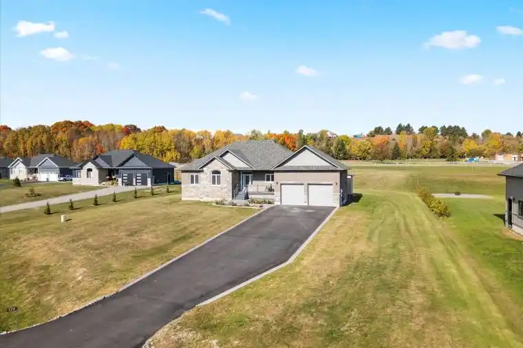 Welcome to 172 Glens of Antrim Way, an exceptional residence in an exclusive enclave of just six custom designs, featuring the highly sought-after “Brimely” model. This bright, open-concept detached bungalow offers 3 spacious bedrooms and 2 beautifully appointed full bathrooms, thoughtfully designed for both comfort and style. Set on an impressive approximately 1-acre lot, the home welcomes you with a long private driveway accommodating up to 10 vehicles and a charming front porch. Inside, the expansive great room showcases soaring ceilings and a striking modern fireplace feature wall, creating an inviting yet sophisticated atmosphere. The chef-inspired eat-in kitchen is ideal for everyday living and entertaining, featuring modern appliances, a large island, sleek white cabinetry, contemporary backsplash, pantry storage, and walk-out access to the spacious backyard and patio-perfect for indoor-outdoor gatherings. The primary suite is a serene retreat, offering a luxurious upgraded ensuite with heated floors and a generous walk-in closet. Additional bedrooms are bright and well-proportioned, ideal for family or guests.Enjoy peaceful country living with all the conveniences, located under an hour from the GTA and just a short drive to the lakeside town of Cobourg. This remarkable property offers space, privacy, and refined living in a truly special community.A must-see home in an exclusive setting.