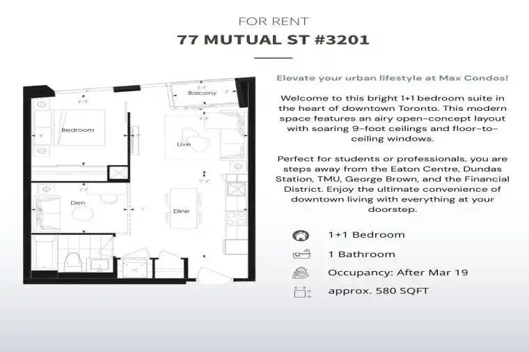 Well-lit 1-bedroom plus den unit with a den. The space features a practical layout, spanning approx. 580 sf., and boasts 9-foot ceilings. Throughout the unit, you’ll find laminate flooring, and the modern open-concept kitchen includes a breakfast bar. Floor-to-ceiling windows allow for ample natural light. Conveniently located steps away from the Eaton Centre, Dundas Subway Station, George Brown College, the Financial District, Ryerson University, University of Toronto, OCAD, and with 24-hour TTC. Nearby are various shops, restaurants, banks, and more for added convenience. Students and New comers are welcome! **EXTRAS** Built-In Fridge, Stove, Flat Cook-Top, Build-In Dishwasher, Microwave, Stacked Washer & Dryer. All Elf’s & All Window Coverings. *NON SMOKERS, NO PETS PREFERRED*
