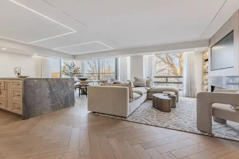 Experience sophisticated living in this meticulously renovated 2-bedroom,FULLY FURNISHED 2-bath suite nestled in the prestigious Forest Hill Village. Spanning approximately 1,450 sq. ft., this residence boasts an open-concept design complemented by exquisite custom finishes. The gourmet kitchen features a waterfall island with a built-in bar fridge, high-end Gaggenau appliances, and a sleek electric downdraft hood fan seamlessly integrated into the cabinetry. A reverse-osmosis water tap enhances the culinary experience. Elegant wood paneling, a built-in electric fireplace, herringbone hardwood floors, and thoughtfully curated lighting create a warm and inviting ambiance throughout. The primary suite offers custom closets and a luxurious ensuite with a glass-enclosed shower, soaking tub, and double sinks. An oversized laundry room with full-size appliances provides ample storage. Included are one parking space and EXTRA LARGE WALK IN a storage locker. The lease encompasses bi-weekly cleaning for added convenience. Building amenities include a renovated pool, fitness centre, sauna, stylish party room, and a sunlit outdoor terrace with BBQs. This boutique 35-suite residence offers an exceptional blend of comfort, style, and prime location in the heart of Forest Hill Village. Minutes to the TTC Subway and Loblaws.