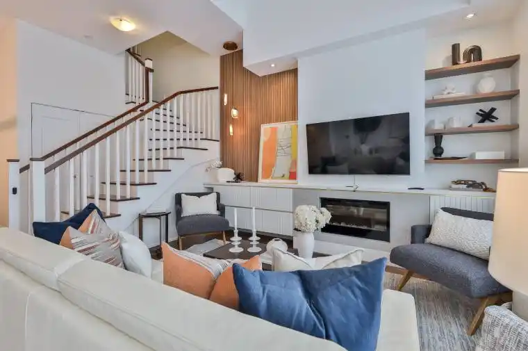 Welcome to The Upper House, a luxury townhouse in this boutique condo offering exquisite style & an abundance of space in family-friendly Leaside. This 2-storey home features 1462 SF of interior living plus a 275 SF terrace with BBQ gas line, for a total of 1737 SF. The open concept main floor impresses with soaring 12-ft smooth ceilings, custom Hunter Douglas remote controlled blinds and prefinished engineered hardwood flrs. A show-stopping, wall-to-wall custom entertainment unit anchors the living room, complete with bespoke cabinetry, pot lights, decorative wood paneling, and a contemporary fireplace with mantle & wall-mounted TV with statement light fixture. The dining area sits perfectly between the living room and terrace walk-out, making it ideal for dinners by the fireplace as well as enjoying abundant natural light while at breakfast. The modern chef’s kitchen is outfitted with top-of-the-line appliances, including a paneled fridge, dishwasher, and paneled pantry offering functionality while maintaining symmetry. The main floor also includes a large den/office with a double-door closet, which can easily be converted to a third bedroom by adding a wall & glazed French door for privacy. Don’t miss the powder rm on the main floor. The upper level enjoys an oversized family room with a 2nd wall-mounted TV (all tvs included) for family movie nights. The principal bedroom features a walk-out to a second outdoor space, his & hers closets and a spa-like ensuite with a glassed-in shower, soaker tub, and double sinks. The 4 PC bath serves the 2 bdrm and family rm. This fabulous offering includes parking and locker. Note this is a pet-friendly building complete with a pet-spa and no size restrictions for your fur babies. A rare opportunity to own a refined townhouse with exceptional design and superior quality finishes (refer to attached Features & Upgrades) in the heart of Leaside! In the top-tier Rolph Rd ES, Bessboroug Dr MS & Leaside High School district.